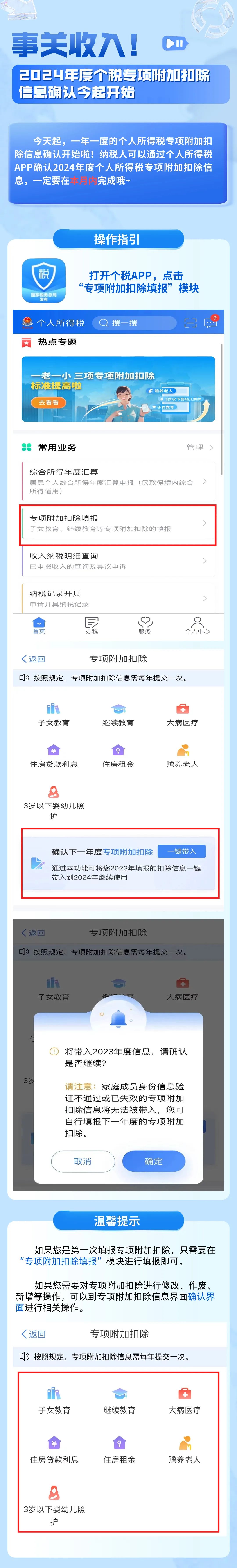 今天起,一年一度的個(gè)人所得稅專(zhuān)項(xiàng)附加扣除信息確認(rèn)開(kāi)始啦!納稅人可以通過(guò)個(gè)人所得稅APP確認(rèn)2024年度個(gè)人所得稅專(zhuān)項(xiàng)附加扣除信息,一定要在本月內(nèi)完成哦~